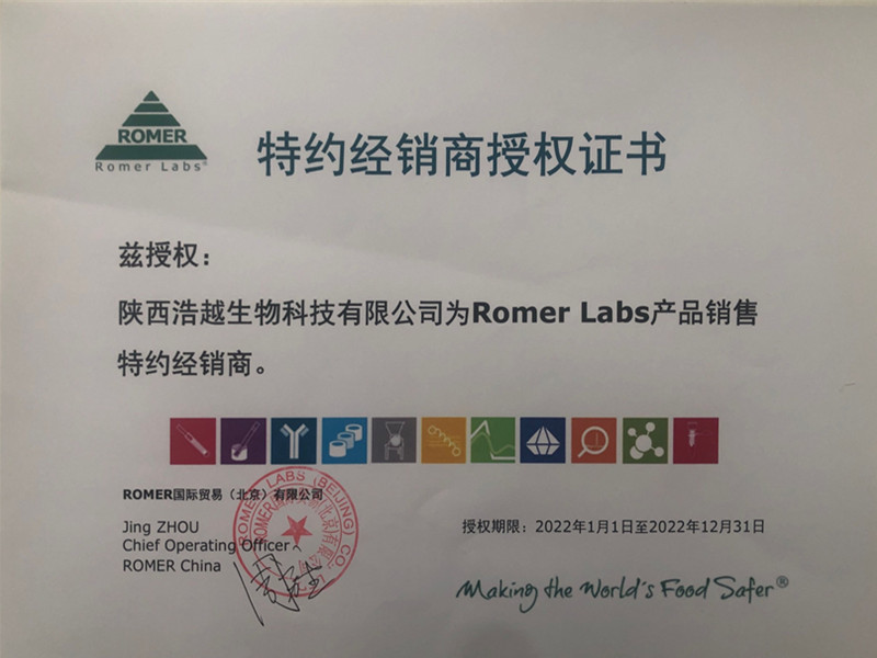 陜西浩越生物科技有限公司代理經營Romer Labs China Ltd.真菌毒素系列檢測產品、AgraStrip和AgraQuant過敏原等產品。 Romer Labs@由Tom和Marie Romer于1982年成立于美國華盛頓,主要進行真菌毒素的檢測,為相關研究單位和企業提供技術方面的服務。1999年,集團控股公司Erber AG (奧地利控股公司)收購了Romer Labs@,并以多個專業的研究機構前身作為公司檢驗產品的技術研發平臺,專注于食品安全檢測的技術研發和服務領域,以4個ISO 17025 國際認證的食品安全實驗室為技術服務支撐,致力于確保從原料到加工再到成品的整條供應鏈中各階段檢測結果的高品質,其研發生產的檢測產品和檢驗分析服務面向整個農業和食品產業鏈,從產地農場的篩查,到尖端的檢測分析實驗室,為全球各大型企業及政府監管機構提供檢驗產品、技術應用、解決方案以及實驗室能力驗證等服務。