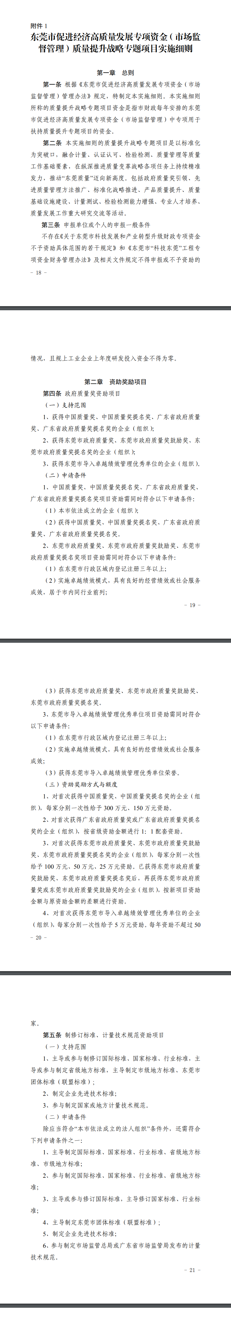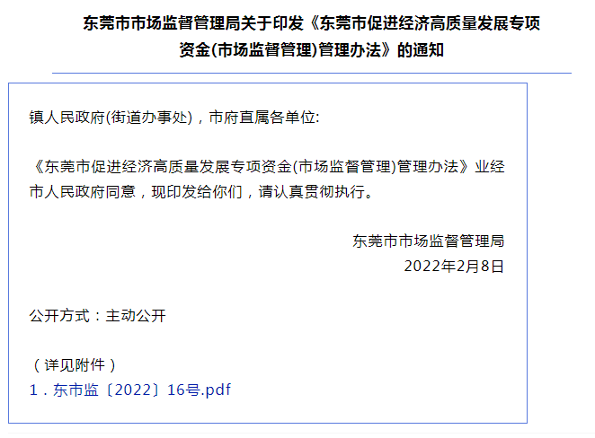 近日,東莞市市場監督管理局印發《東莞市促進經濟高質量發展專項資金(市場監督管理)管理辦法》,《辦法》涉及質量提升、知識產權兩個大類、28個資助項目,首期專項資金規模1.07億元,最高單項獎勵資金達3000萬元,并將連續實施三年。《辦法》明確,首次獲得實驗室認可(CNAS)能力認定的本地企事業單位給予不超過10萬元資助!掇k法》中的《東莞市促進經濟高質量發展專項資金(市場監督管理)質量提升戰略專題項目實施細則》為符合條件的企事業單位、行業協會、社會組織以及個人提供覆蓋質量、標準化、計量、檢測、認證、等領域的全方位資助服務,現將相關內容摘編如下: 《東莞市促進經濟高質量發展專項資金(市場監督管理)質量提升戰略專題項目實施細則》全文如下: 信息來源:東莞市市場監督管理局