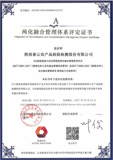 陜西秦云農檢榮獲兩化融合管理體系A級評定證書