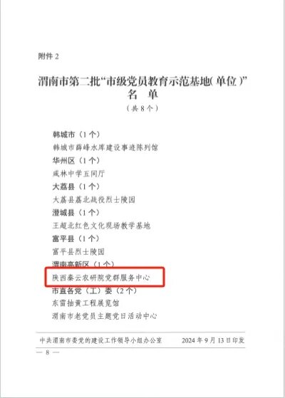 陜西秦云農研院黨群服務中心被命名為“市級黨員教育示范基地(單位)”