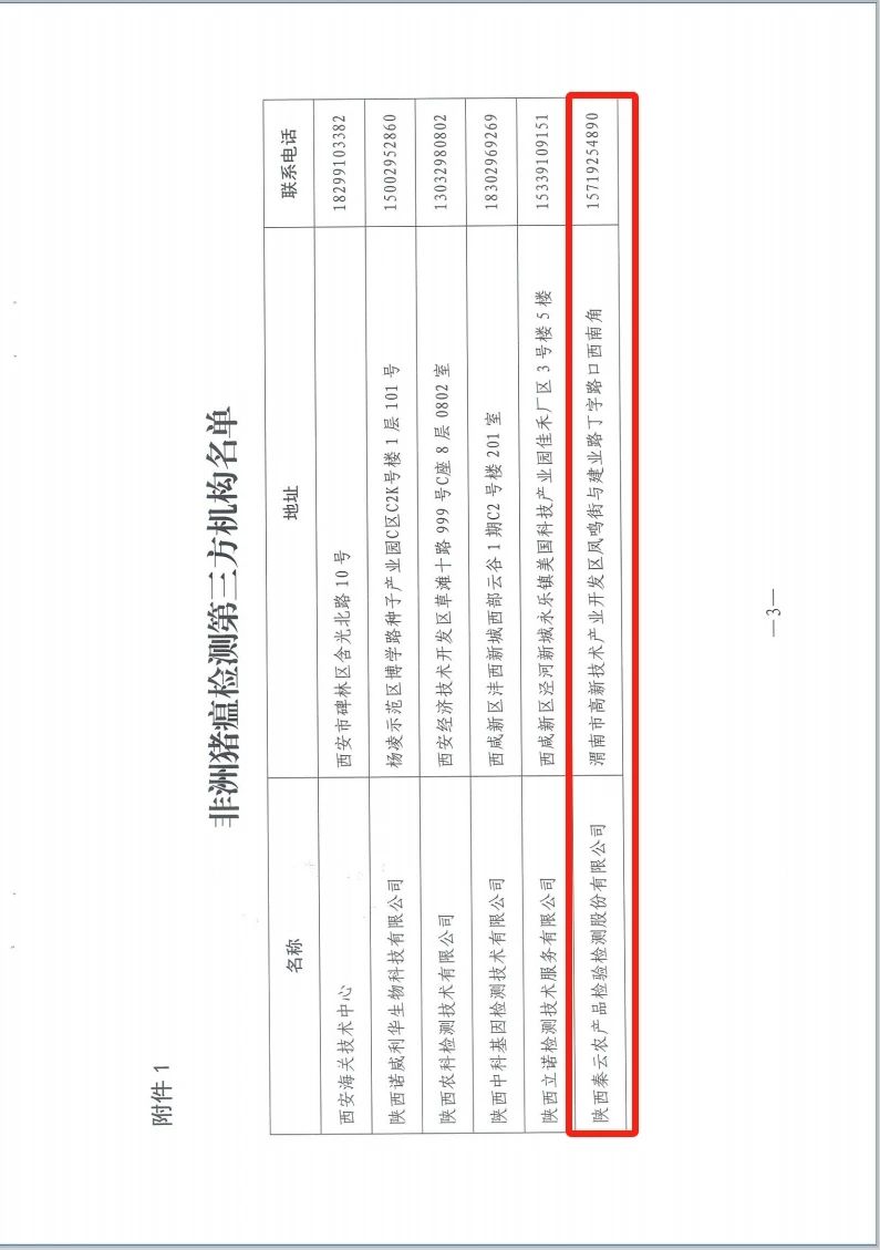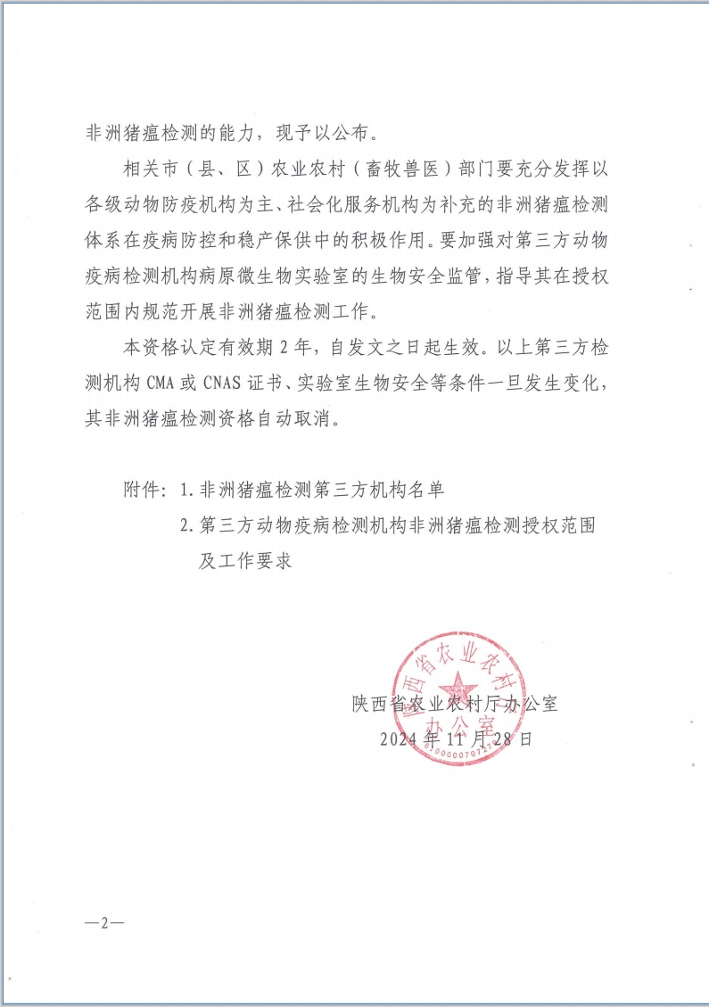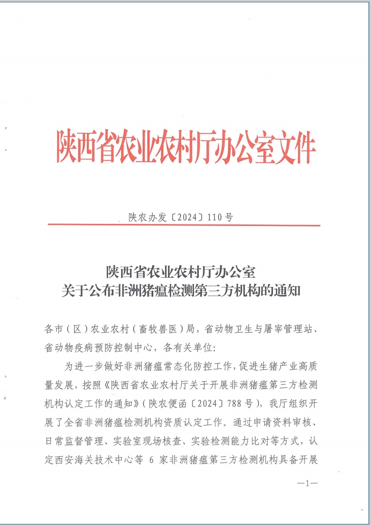 11月28日,陜西省農(nóng)業(yè)農(nóng)村廳辦公室印發(fā)《關(guān)于公布非洲豬瘟檢測第三方機(jī)構(gòu)的通知》,陜西秦云農(nóng)產(chǎn)品檢驗(yàn)檢測股份有限公司成功通過陜西省非洲豬瘟社會(huì)第三方檢測機(jī)構(gòu)認(rèn)定。