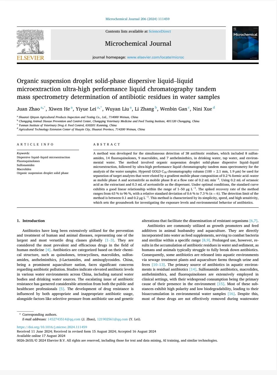 日前,由陜西秦云農產品檢驗檢測股份有限公司科研人員趙娟為第一作者的論文“Organic suspension droplet solid-phase dispersive liquid-liquidmicroextraction ultr...
