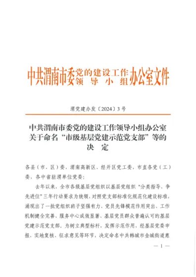 日前,中共渭南市委黨的建設工作領導小組辦公室印發關于命名“市級基層黨建示范黨支部”等的決定,對31個“市級基層黨建示范黨支部”和8個“市級...