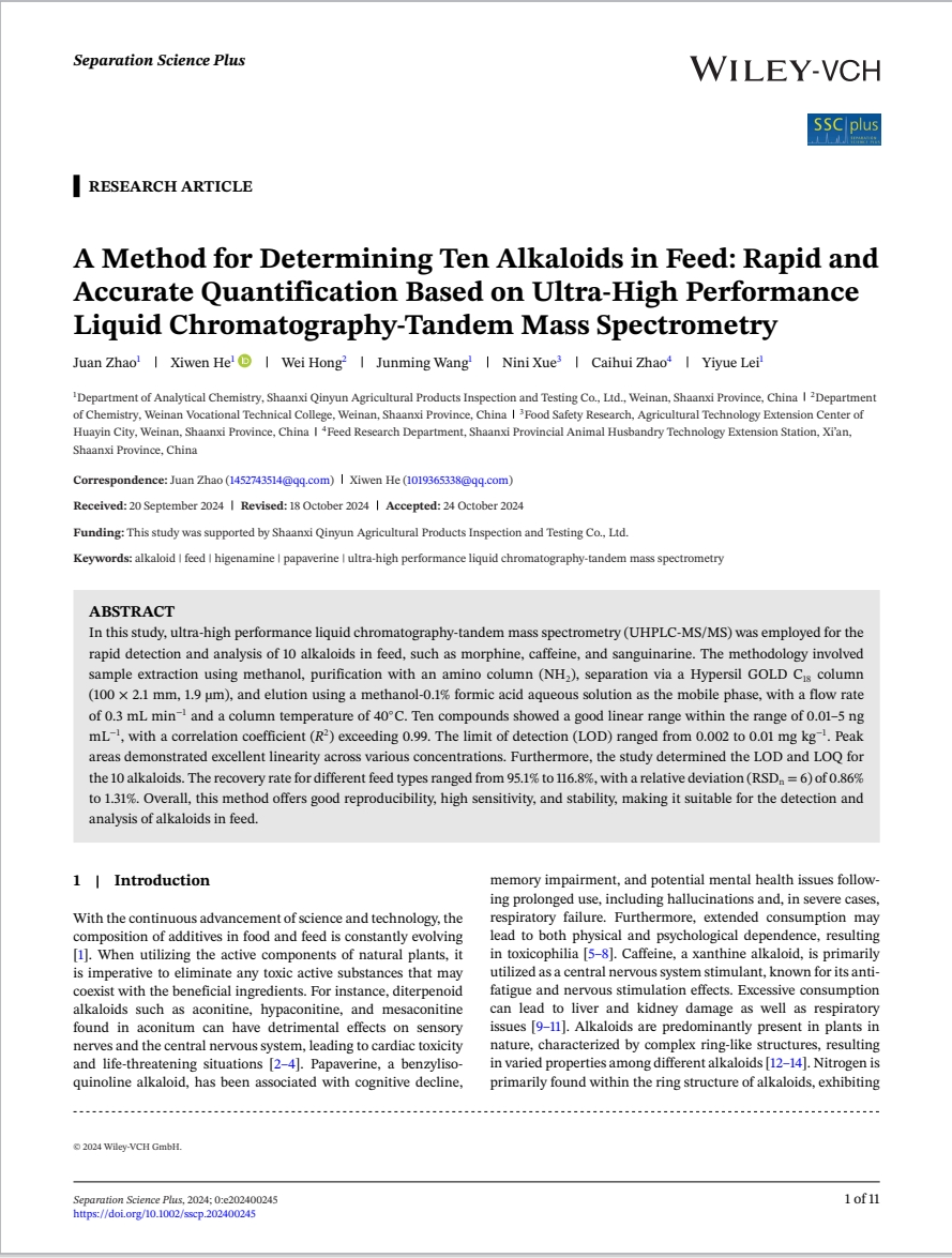 近日,陜西秦云農產品檢驗檢測股份有限公司科研團隊成員趙娟以第一作者身份在分析化學領域國際權威期刊...